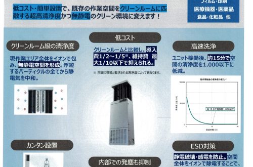 今回、ご紹介する製品はクリーンルームに匹敵する既存の作業空間をクリーンな環境へ変えます~!!(特長)①簡単に設置可能⇒設置工事不要、既存のレイアウト変更不要。②クリーンルーム級の清浄度⇒作業エリアをイオンで包み無静電空間を形成します。③クリーンルームと比較して費用を抑えます⇒導入費1/2~1/5、維持費は最大1/10以下に抑えます。④その他⇒高速洗浄、内部での発塵も抑制、ESD対策レベルの向上が可能です。この製品をご検討のうえ、新しい概念によるクリーン環境を構築しましょう。まずは、お気軽にムトぴょんまでお声掛けください~!!
